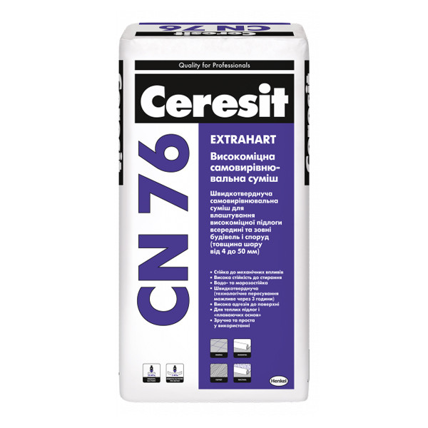 Суміш Ceresit CN 76 призначена для пристрою покриття підлоги на бетонних поверхнях усередині та зовні будівель і споруд промислового та громадського призначення. Розчинну суміш Ceresit CN 76 можна використовувати для пристрою покриття підлоги з ухилом, а також у конструкціях підлог із підігрівом. Для поліпшення експлуатаційних властивостей (міцності, стирання, безповільності) рекомендується провести просочення або фарбування матеріалами для підлог TM Ceresit.