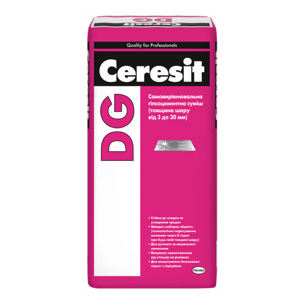 Самовирівнювальна суміш Ceresit DG призначена для пристрою прошарок підлоги, вирівнювання цементно-піщаних і бетонних стяжок перед облицюванням плиткою, укладанням паркету, лінолеуму, килимового та інших покриттів у приміщеннях зі звичайним рівнем вологості (коридори, спальні, дитячі кімнати, кухні, фойє) із товщиною шару від 3 до 30 мм за один раз. Рекомендується для пристрою систем "тепла підлога". Ефективна для нанесення як ручним, так і механізованим способом. За потреби нанесення другого шару основу (перший шар) необхідно відшліфувати та заґрунтувати. Під час нанесення шару завтовшки 30-80 мм необхідно використовувати суміш Ceresit DG і 30% заповніть (піска).